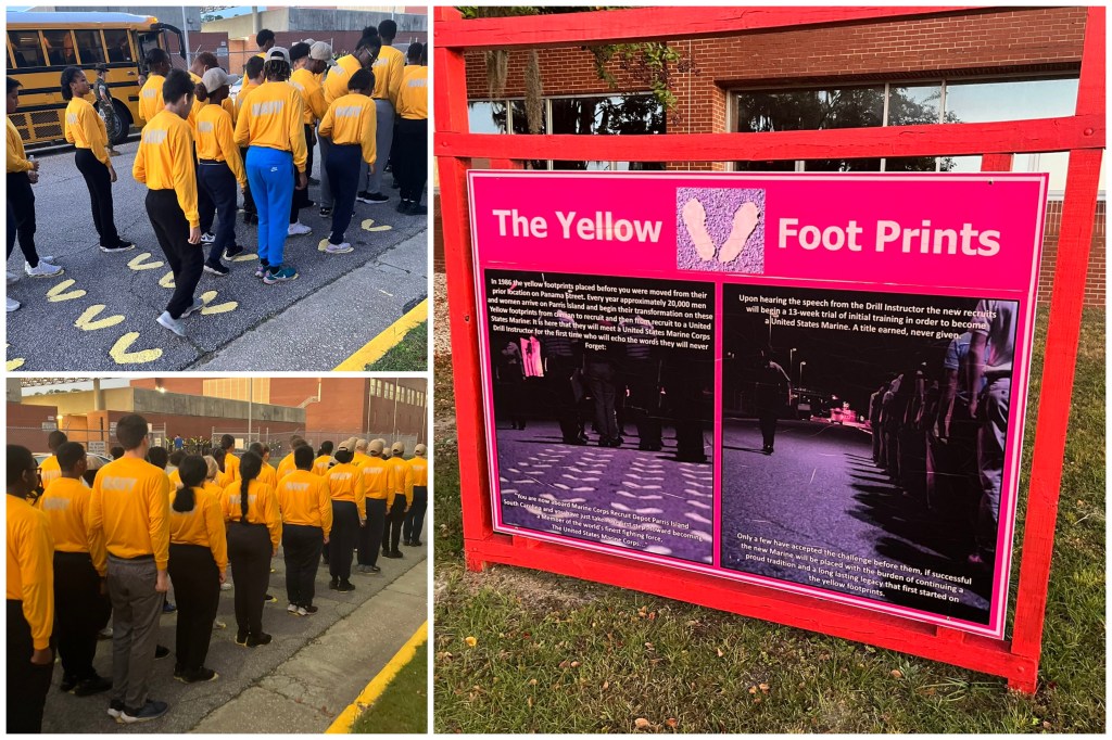 NJROTC Cadets visit Parris Island and learn the tradition of the Yellow Foot Prints, the transformation from civilian to recruit, and then from recruit to UNITED STATES MARINE.