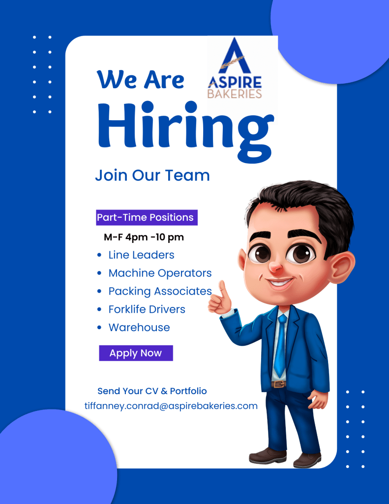Aspire Bakeries has immediate openings for holiday help and would like to give RNE students and their families the opportunity to apply for these jobs first. These part-time positions can turn into full-time employment. Seasonal positions are also available for educators during the winter break.