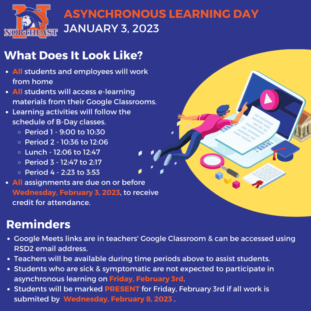 Richland Northeast will have an asynchronous e-learning day. Students will work from home on assignments posted in Google Classroom by their B-day teachers. All assignments must be completed and turned in by Wednesday, February 3, 2023, to be marked present for Friday, February 3, 2023.