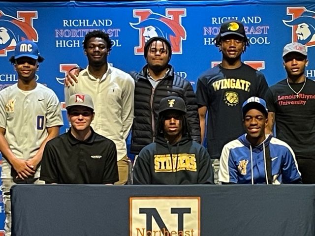Standing (L-R): Jaylen Halley – Morris College, Zack Watkins – Fayetteville State, Jason Taylor – Cisco College, Everett, Joyner – Wingate University, Avonte Grant — Lenoir-Rhyne.