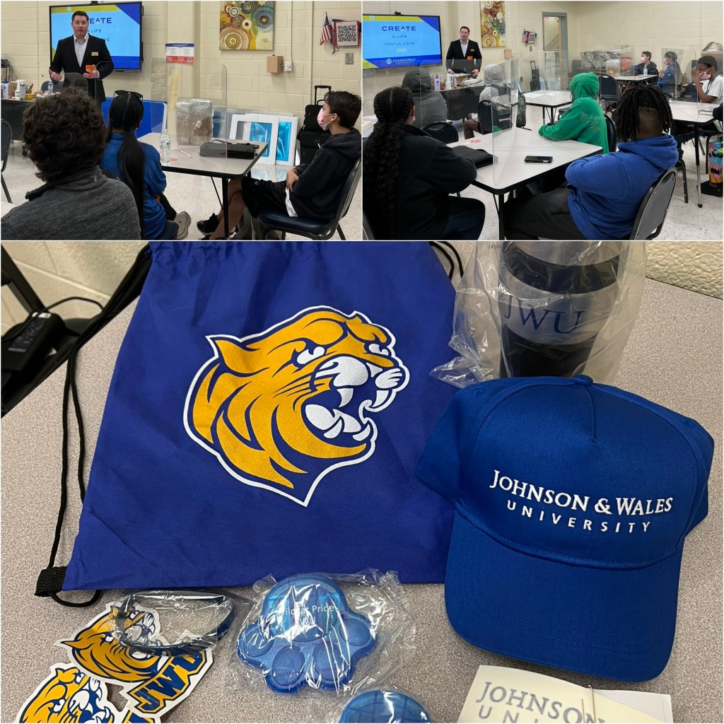 Austin Vennetti, a Johnson & Wales University representative, stopped by to talk to the Culinary Arts students about Johnson & Wales program. He also left some swag for Chef Woodward.
