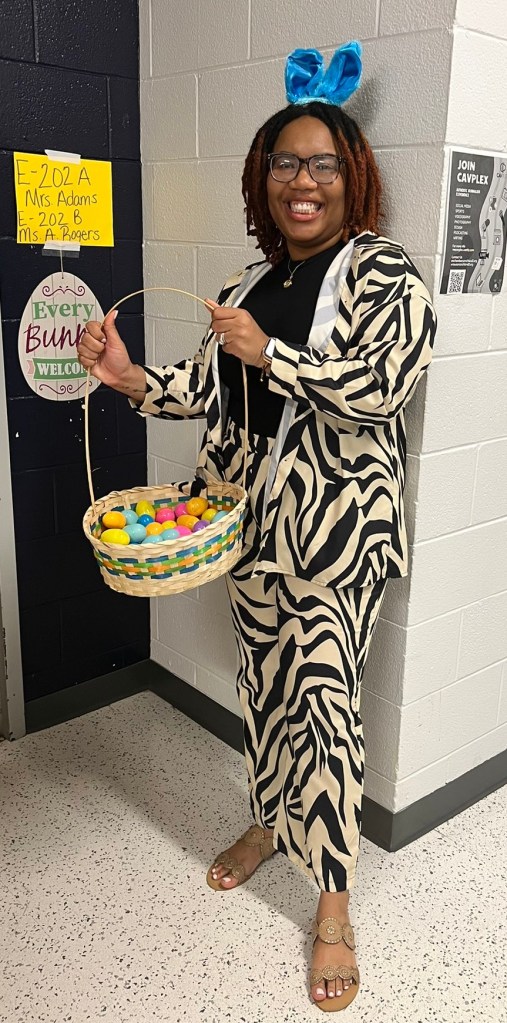Mrs. Black, RNE’s Behavior Interventionist Specialist, is always surprising the staff. On April 3rd, she visited Ms. Rogers and other fabulous RNE teachers in her zebra-printed bunny outfit to give out some “Easter Eggs”. Loving every moment, she is our “Energizer Bunny” We love how she always spreads joy sharing smiles with everyone. Thank you Mrs. Black for all you do.