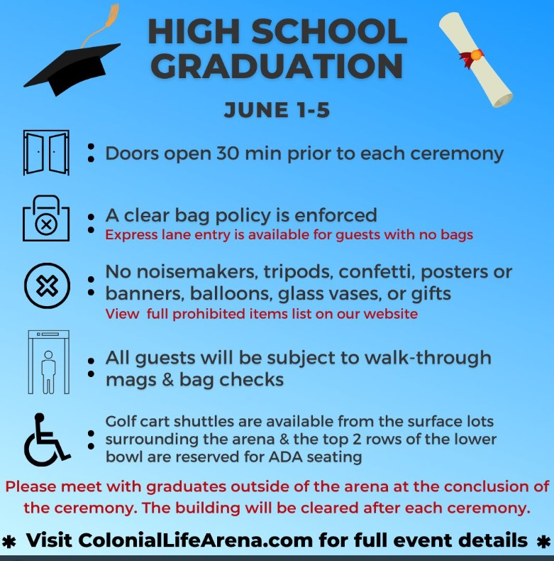 It’s your graduation and we can’t wait to celebrate you at 4 PM today at the Colonial Life Arena. There is a Clear Bag policy in place at the arena. Please click on the above image for links to live stream our graduation.