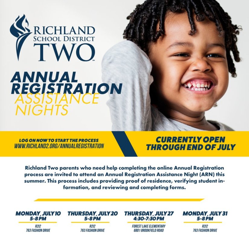 For each Annual Registration Assistance Night, Richland Two will be able to assist all families with language interpreters; however, the July 27 Annual Registration Night/Fiesta Conexiones 2023 will have more Spanish speakers to assist than the other nights. So don’t forget to schedule your appointment for a day that works best for you. Also, remember all students must have updated Annual Registration and PORs on file in order to remain in school after August 21st.