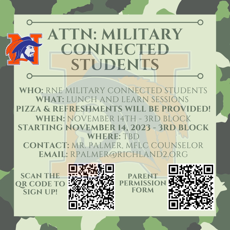Please scan the QR Code on the flyer to register for the 1st meeting. Also, scan the 2nd QR code to download the Parent Permission Form. Please have your parents complete this consent form. NOTE: All participants must be eligible for Military & Family Life Counseling (MFLC) services and have a signed consent form on file with Mr. Palmer, our MFLC counselor.