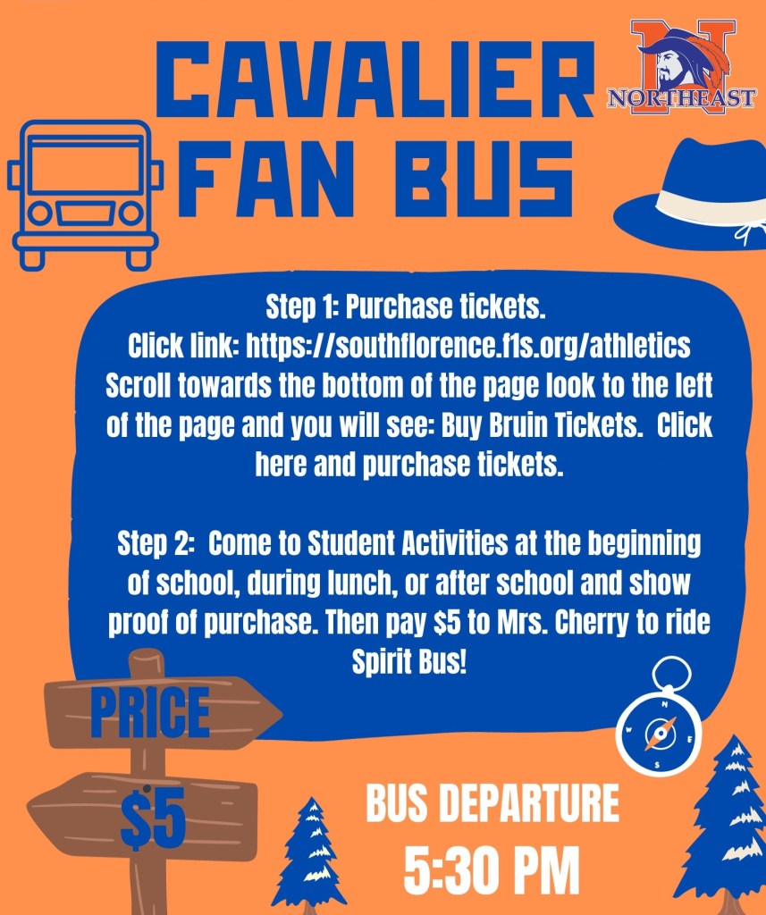 November 9, 2023 November 10, 2023November 14, 2023 Richland Northeast HS Support Our Cavaliers against South Florence Click the image to purchase your tickets. Student Discipline History & School Attendance will be checked before students will be allowed to purchase tickets for the Spirit Bus. Seat Time Recovery Tomorrow Share this: Click to share on X (Opens in new window) X Click to share on Facebook (Opens in new window) Facebook Like Loading...