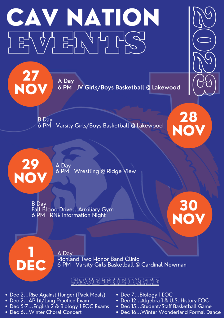November 26, 2023 November 26, 2023November 26, 2023 Richland Northeast HS This Week in CAV Nation Offering the SAT or ACT for Free… Got Over 5 Absences? 1st Semester Seat Time Recovery must be completed by December 20th. If Seat Time is not cleared by this date, students will receive an FA in the course(s) with no additional opportunities to clear FA. Share this: Click to share on X (Opens in new window) X Click to share on Facebook (Opens in new window) Facebook Like Loading...