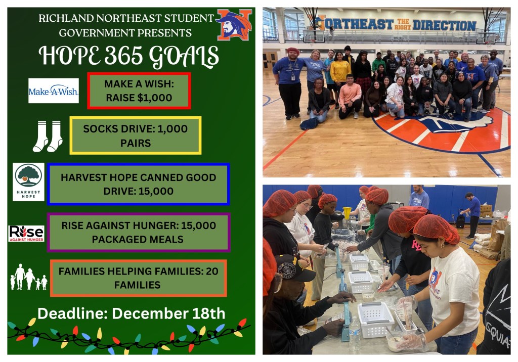 Saturday, December 2nd, Rise Against Hunger packaged 10,000 meals. Huge shoutout to the Interact Club, Student Government, Master Guns Gaston, NJROTC, and the Forest Acres Rotary Club. We are one step closer to reaching our HOPE 365 Goals.