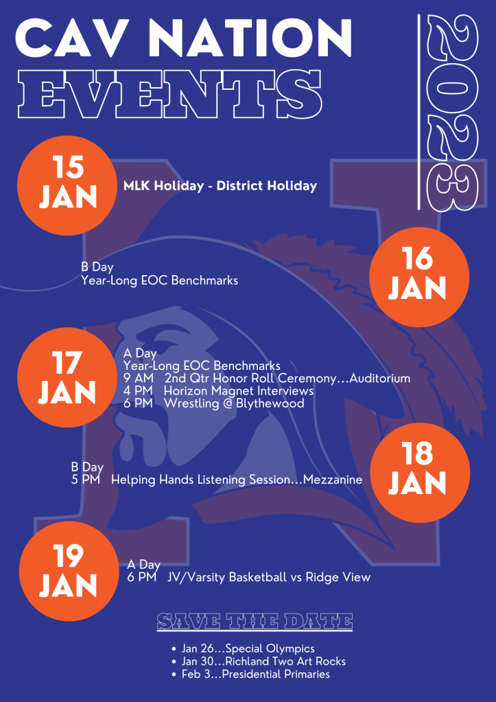 January 15. 2024 January 15, 2024January 15, 2024 Richland Northeast HS Enjoy the Holiday This Week in CAV Nation Class of 2024: Have You Ordered? Click the flyer to access Rhodes’ website & sign up for updates. Juniors Privileges App Now Available Share this: Click to share on X (Opens in new window) X Click to share on Facebook (Opens in new window) Facebook Like Loading...