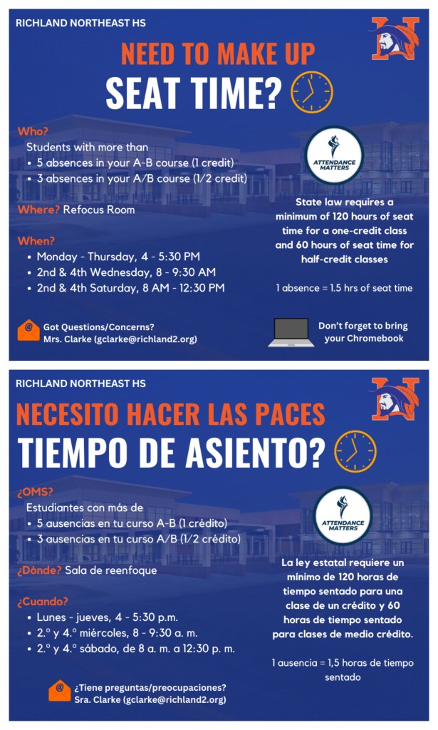 Saturday Work Detail and Seat Time Recovery will be TODAY and March 23rd. Students must report to school by 8:00 AM. Late arrivals will not be accepted. Saturday Work Detail is from 8 – 10 AM and students will report to the Cafeteria. Seat Time Recovery is from 8 AM – 12:30 PM and students will report to the Refocus Room. If you have any questions about Saturday Work Detail or Seat Time Recovery, contact your school administrator or counselor.