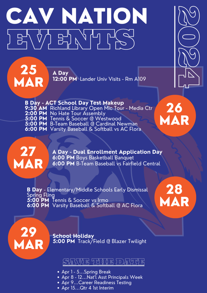 March 24, 2024 March 24, 2024 Richland Northeast HS This Week at CAV Nation Richland Two Spring College Fair Let’s Support NHS Collection Drive Share this: Click to share on X (Opens in new window) X Click to share on Facebook (Opens in new window) Facebook Like Loading...
