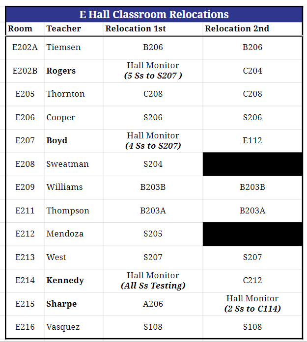 Due to WIN Testing today, all 1st and 2nd block English classes will be relocated. If you have a class on the 2nd floor of E Building, please see the image above to find where your class is relocated for today.