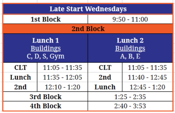 Today, is a different schedule. Not only is it Late Start, we have Cavalier Learning Time and lunch is during 2nd Block. Cavalier Learning Time is an opportunity for you to meet with teachers to get additional academic assistance or complete makeup work. The only change with lunch is that now it is during 2nd block instead of 3rd. We will release students as follows.