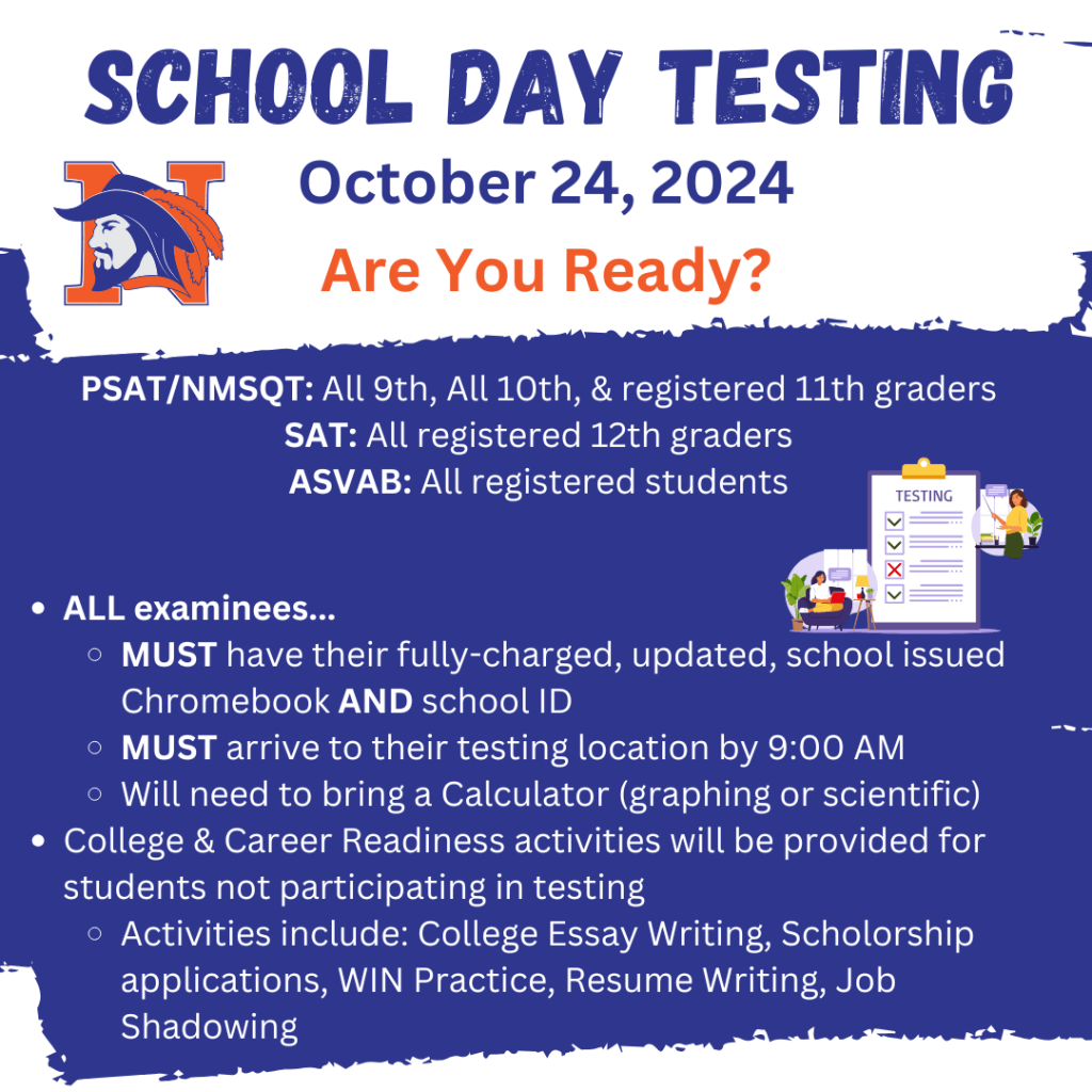 The PSAT/NMSQT and SAT are digital tests so students must bring their school issued Chromebook to take the test. They will need their school ID to enter the room. Calculators are optional and are not needed for testing. If students want to use a calculator, they must bring one to their testing room.