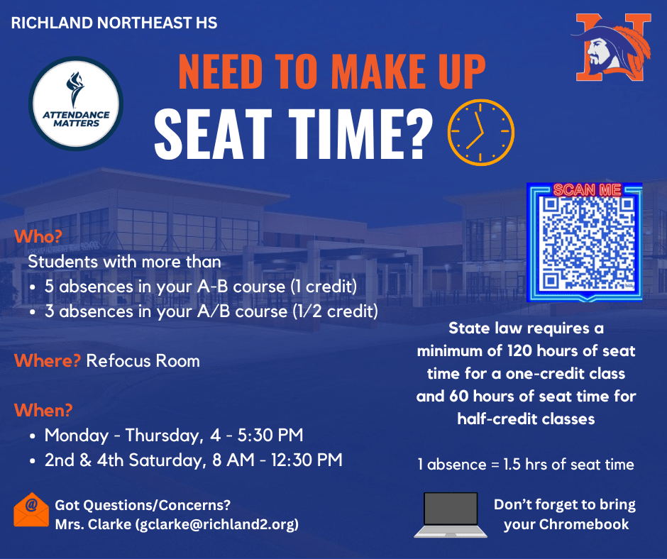 Attend Seat Time Recovery TODAY, 8:00 AM – 12:30 PM and recover up to 3 absences in one class. If you are unable to attend today, please click HERE to register for an after school session or another Saturday session. The last day to recover absences without receiving an FA on your report card is Thursday, December 19, 2024.