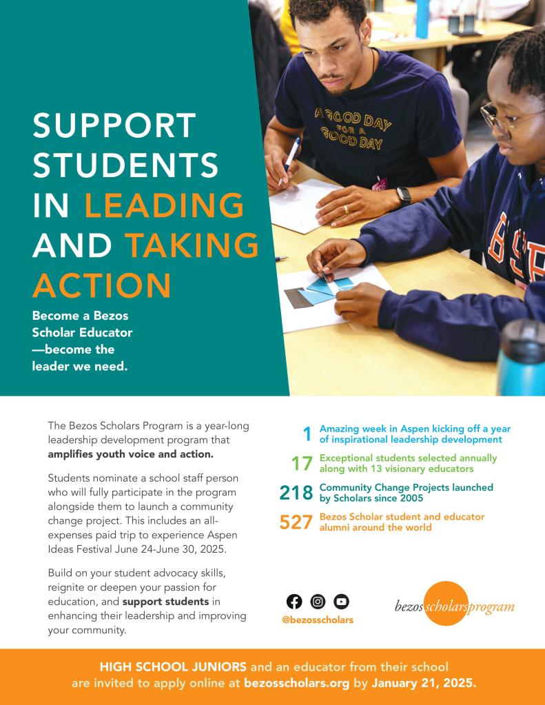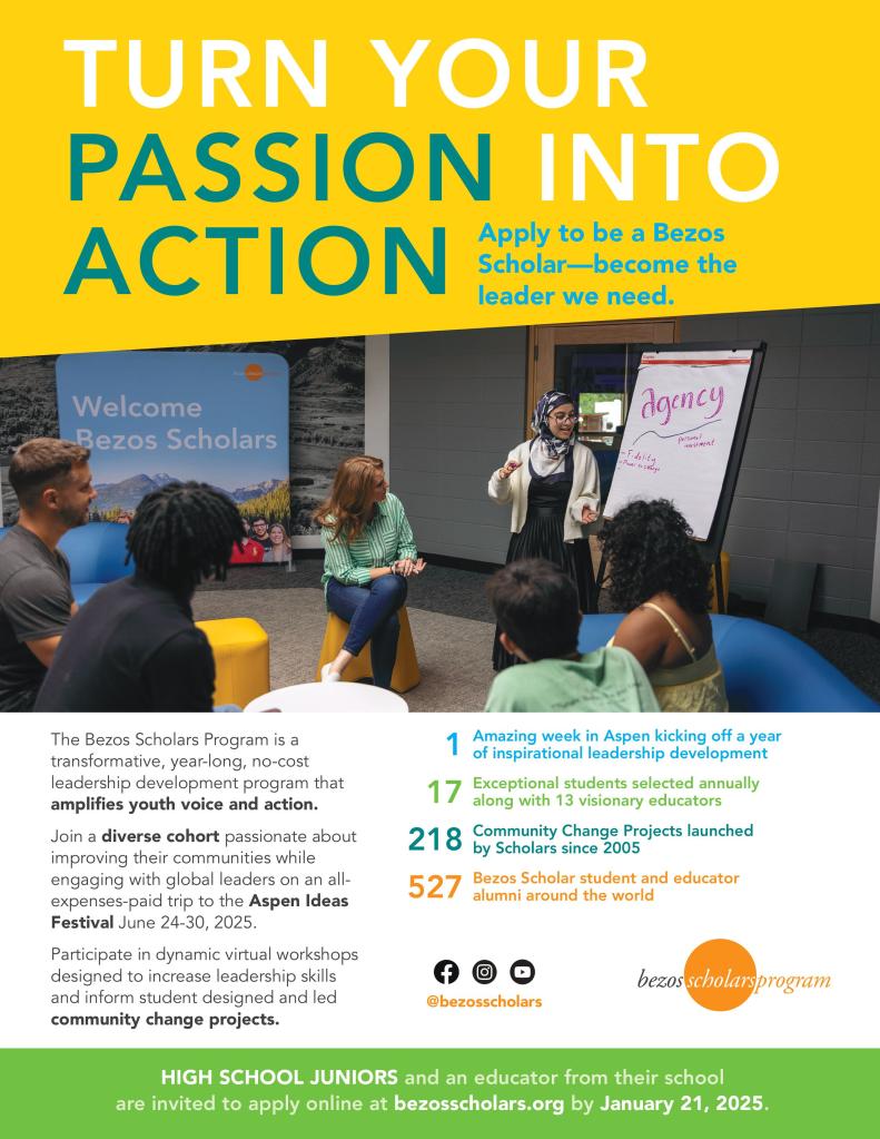 The Bezos Scholars Program (BSP) is looking for current juniors to apply to a transformative leadership development program. Successful Scholars are passionate, intellectually curious young people who are rising leaders in their