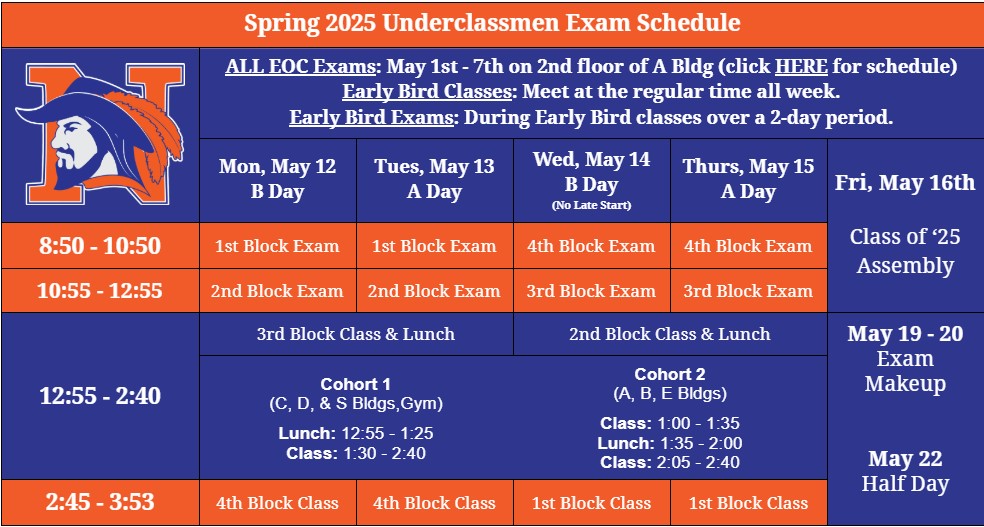 Students must make up assignments and exams by 4:00 PM on Monday, May 19th. Algebra 1, Biology 1, English 2, or U.S. History EOC Makeups will also begin today.