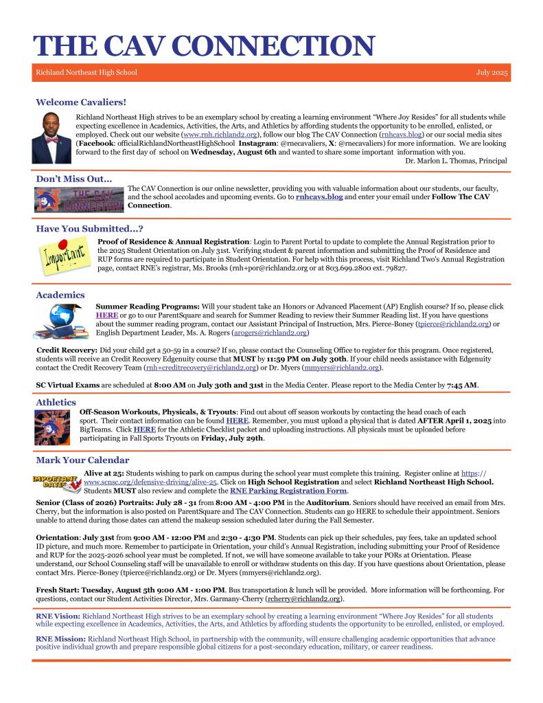July 21, 2025 July 21, 2025July 21, 2025 Richland Northeast HS Back to School Newsletter SAVE THE DATE: Orientation, July 31st REMINDER: You must submit your Proof of Residence in order to participate in Orientation. Don’t Miss Richland Two’s Back to School Event Share this: Click to share on X (Opens in new window) X Click to share on Facebook (Opens in new window) Facebook Like Loading...