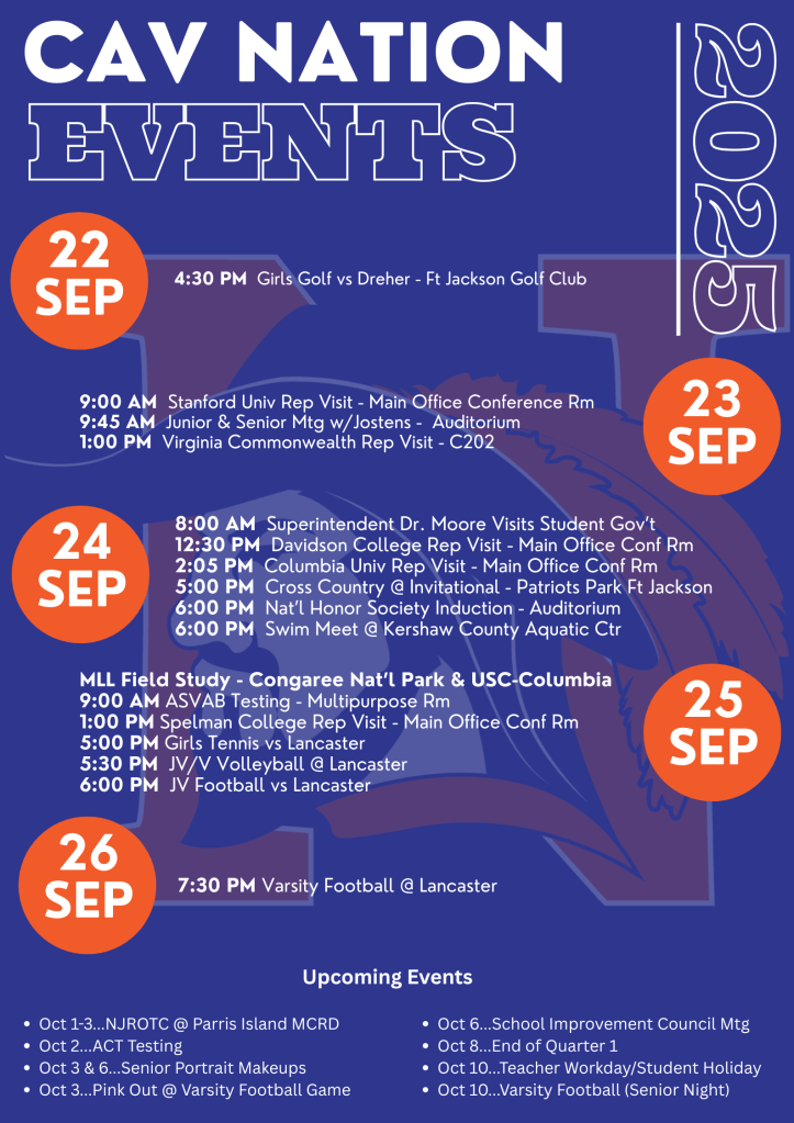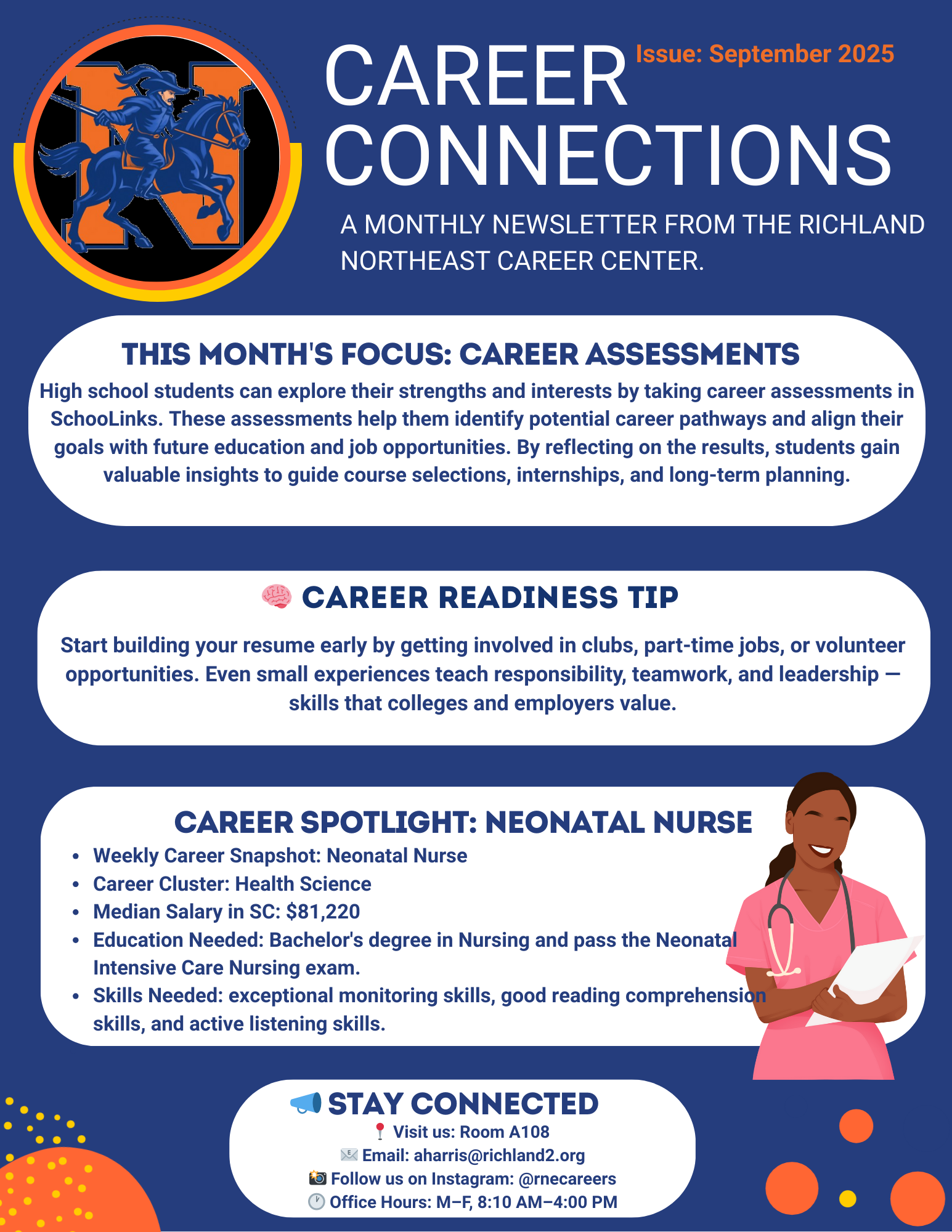 Davidson College will visit RNE from 12:55 to 1:20 PM; Columbia University from 2:05 – 2:30 PM. Seniors & Juniors who have class during these times MUST have a pass from their teachers to attend. Email Mrs. James (cjames@richland2.org) with any questions.